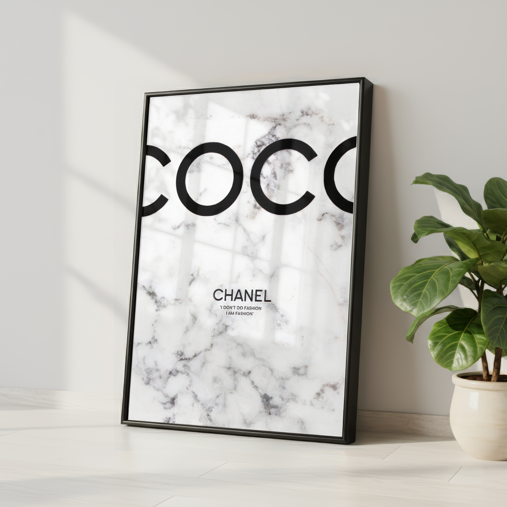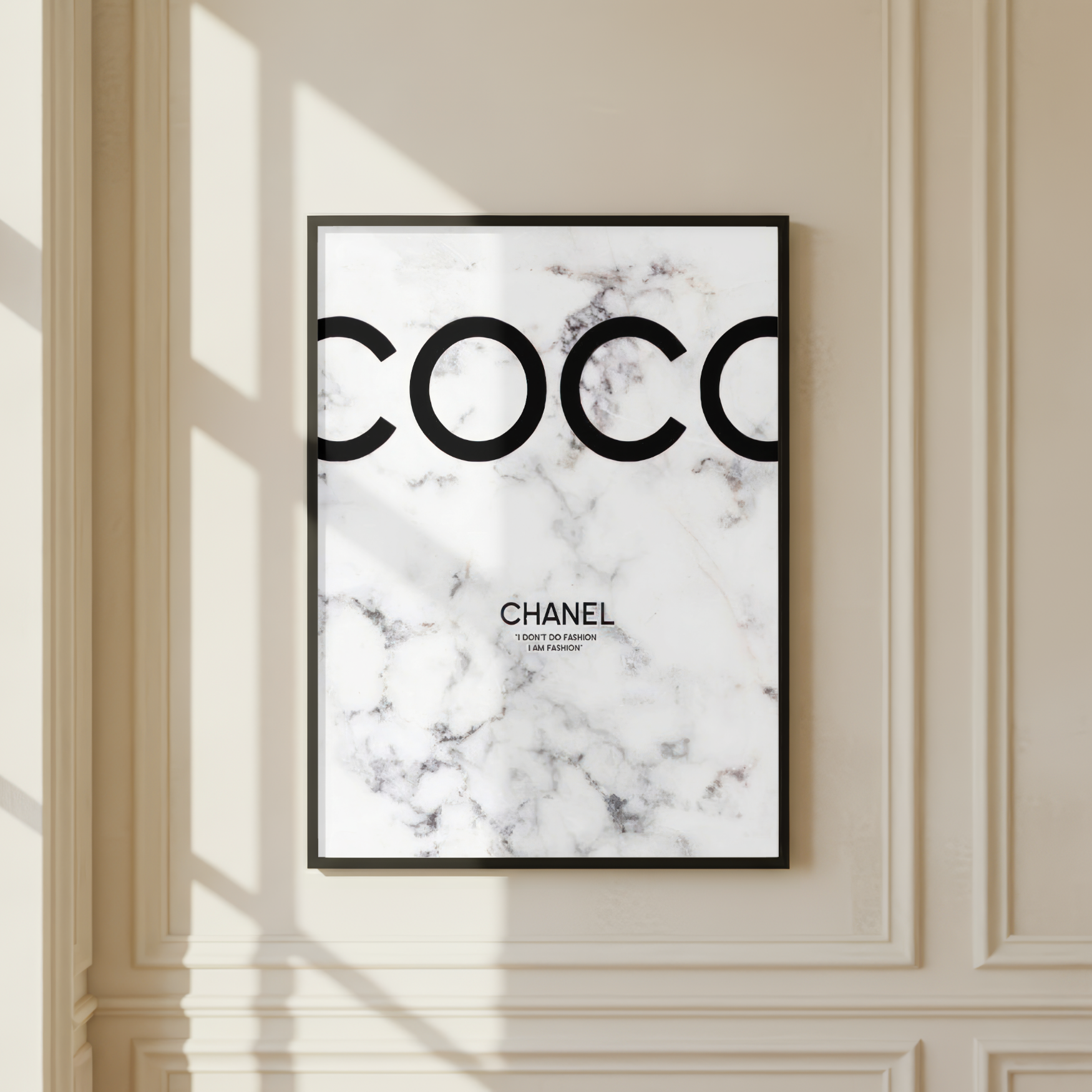 This elegant fashion wall art features a chic marble-effect background paired with bold minimalist typography inspired by iconic couture style. Clean, modern and effortlessly luxurious, this print brings a refined designer aesthetic to any space. The neutral tones and timeless layout make it perfect for bedrooms, dressing rooms, walk-in wardrobes, offices or stylish living areas, whether styled alone or as part of a curated gallery wall.
