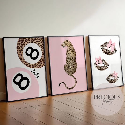 Set of 3 Pink Trendy Preppy Prints Bow's and Lip's Leopard Print Postive Wall Art A5 A4 A3
