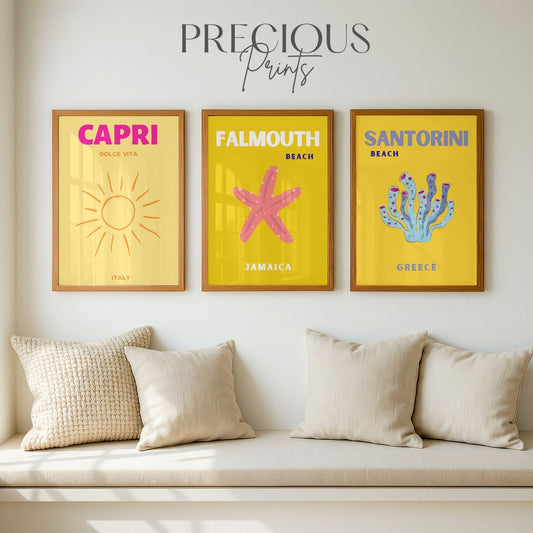 Yellow Summer Travel Poster Set of 3| Capri Santorini Falmouth Wall Art