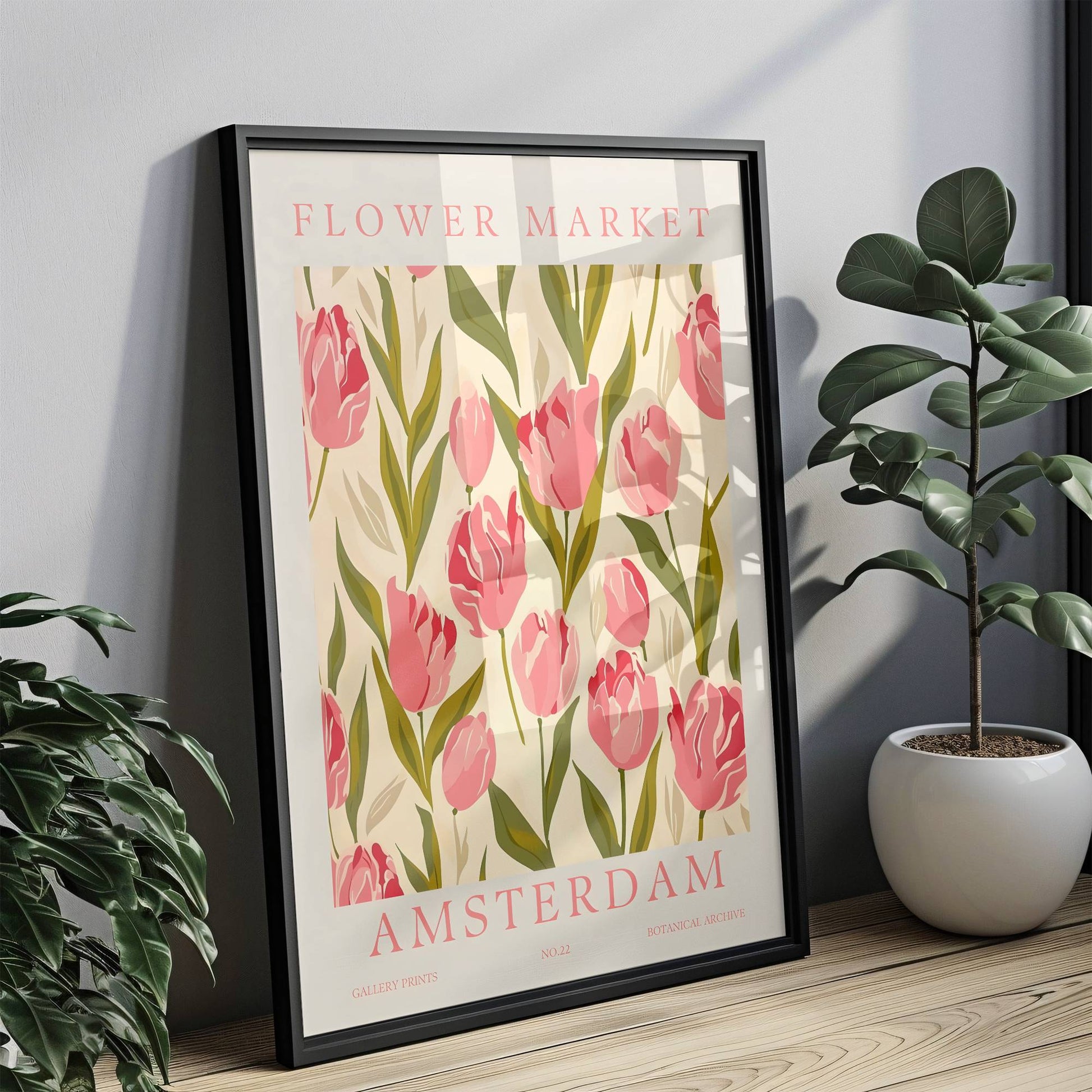 This Amsterdam floral poster captures the essence of Dutch charm with its vintage design featuring iconic striking blooms.