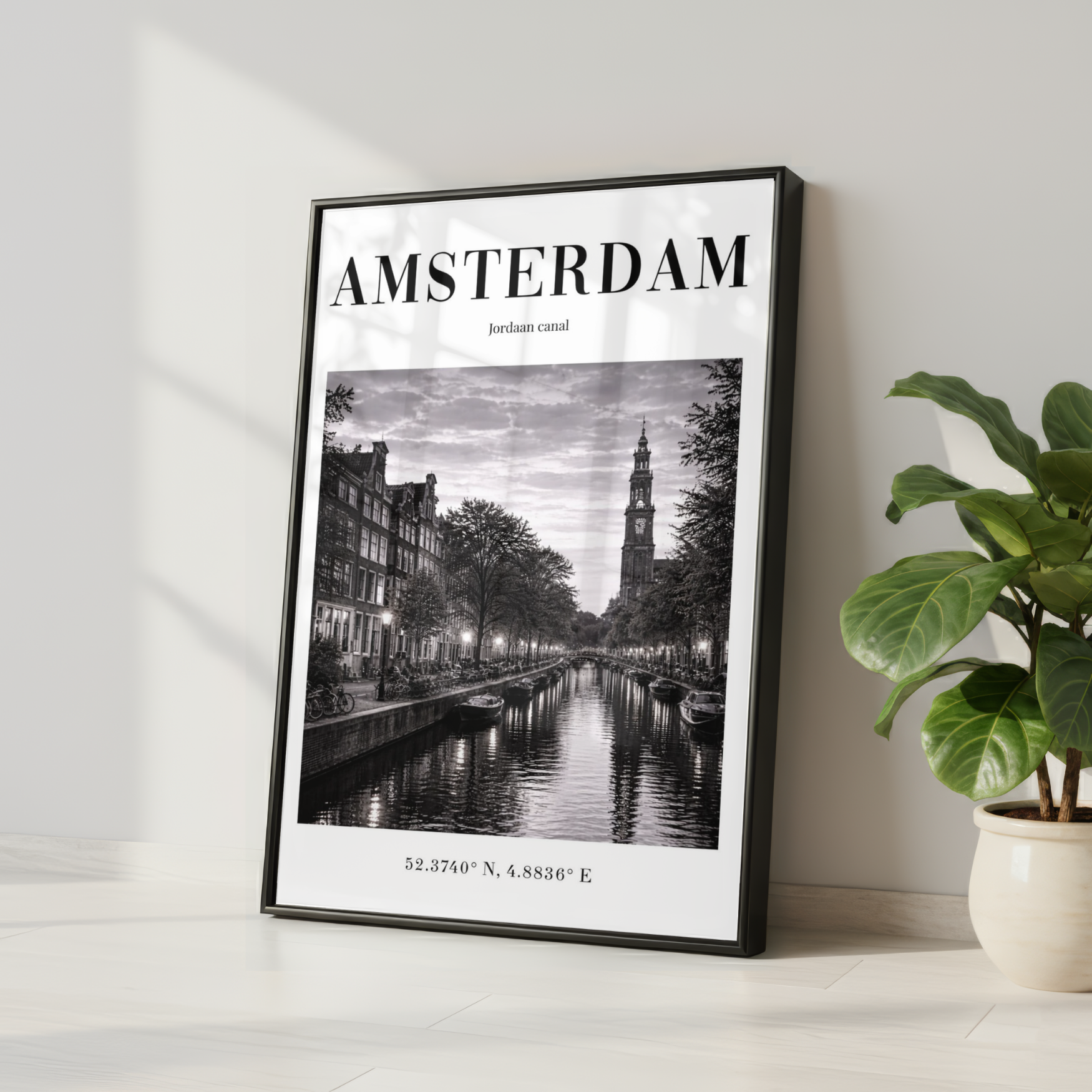 Bring timeless European charm into your home with this elegant Amsterdam Jordaan Canal wall art print. Captured in atmospheric monochrome twilight, this piece showcases the iconic canal houses, peaceful waters and historic church tower that define one of Amsterdam’s most picturesque districts.