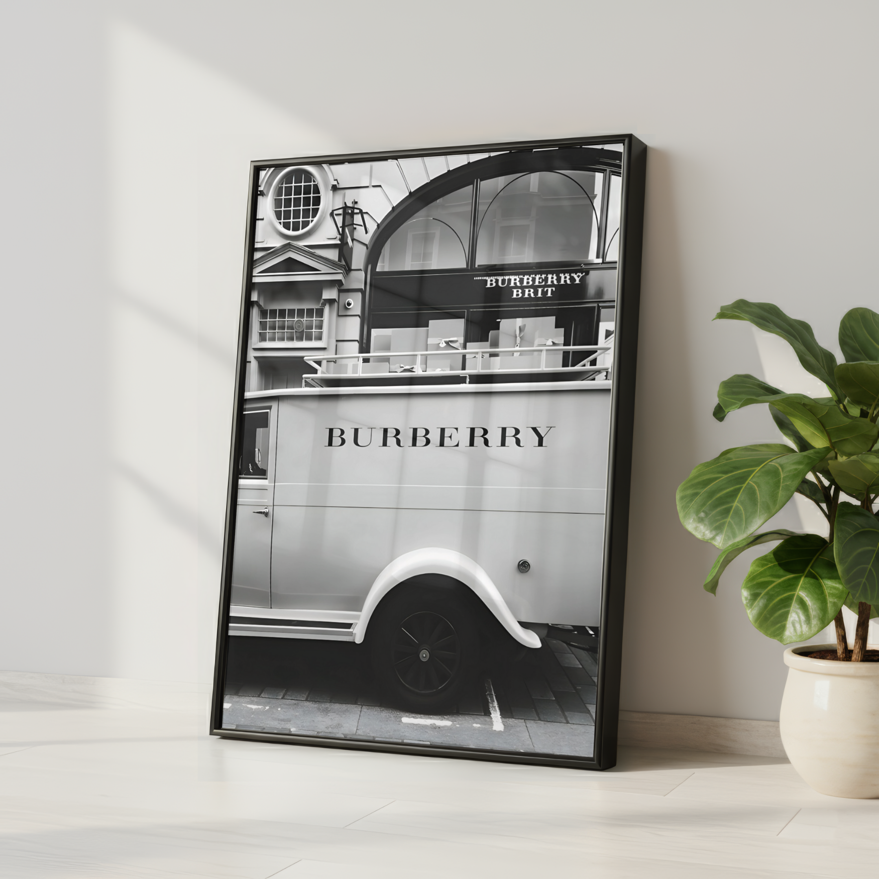 Add modern British elegance to your space with this striking black and white fashion wall art print. Featuring an iconic Burberry street scene with a classic vehicle set against a refined storefront backdrop, this artwork captures timeless style, heritage and contemporary fashion culture.