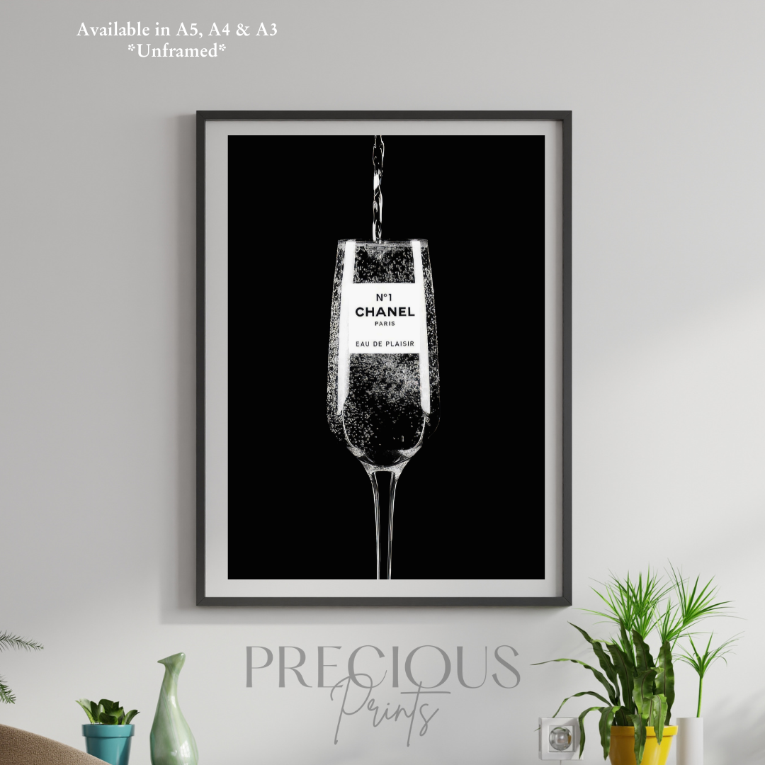 Capture the essence of high fashion with this black and white Chanel poster, featuring a stylish Champagne Glass Printed using premium giclée techniques, this unframed art piece is available in A5, A4, and A3 sizes, making it a perfect addition to any fashion enthusiast’s collection or chic interior. Its timeless design and expert craftsmanship highlight the elegance and sophistication synonymous with designer fashion.