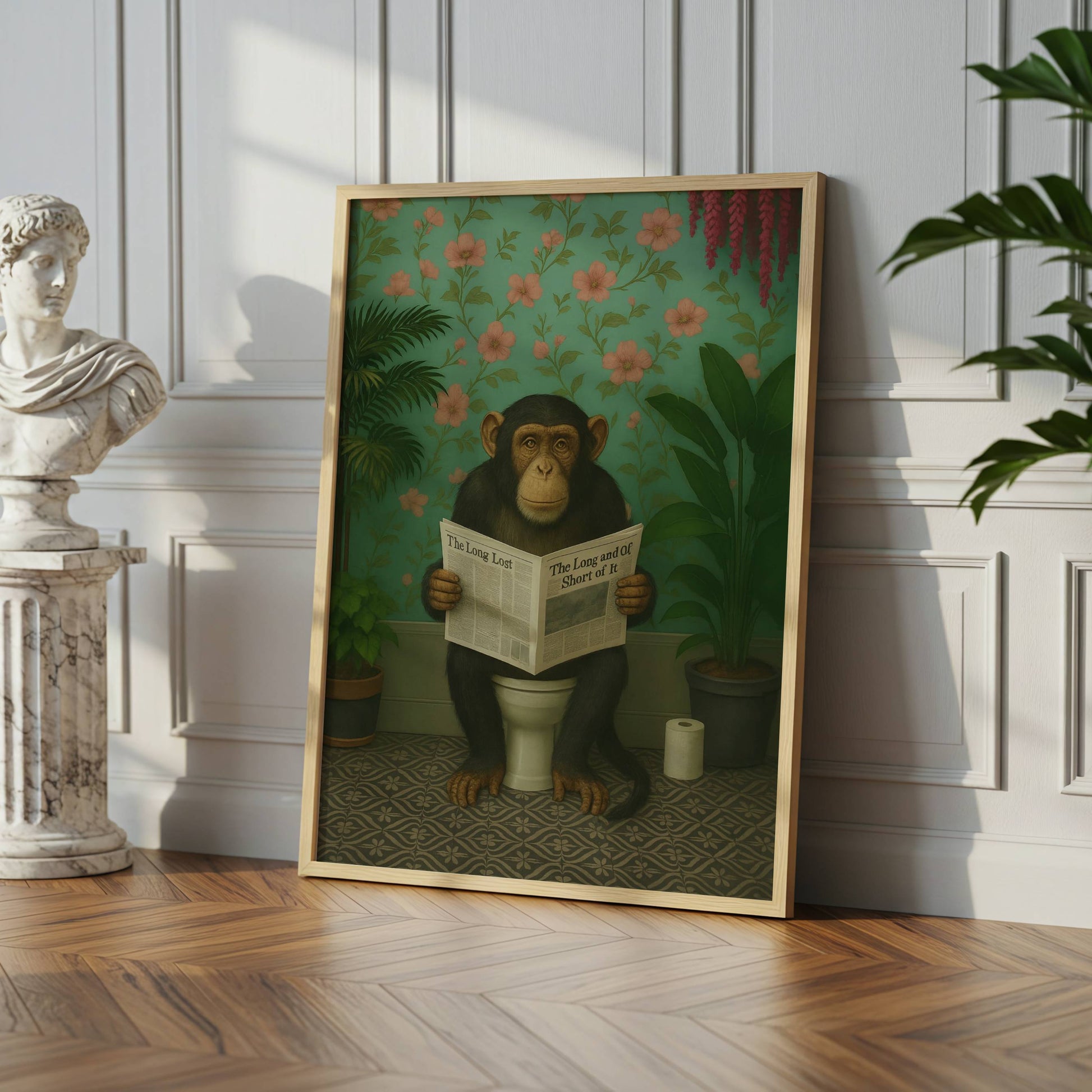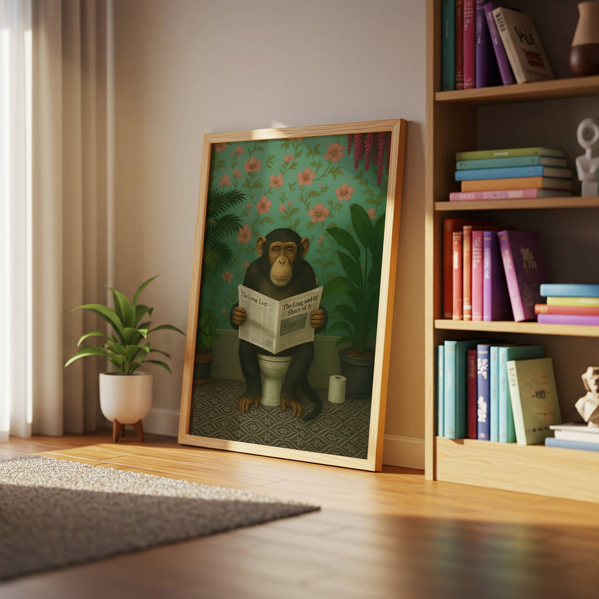 Bring a touch of humor to your space with this playful poster featuring a Chimp reading a newspaper on the toilet. Printed on glossy poster paper, it’s available in A5, A4, and A3 sizes to suit any room. Unframed and ready to brighten your walls with a cheeky twist!
