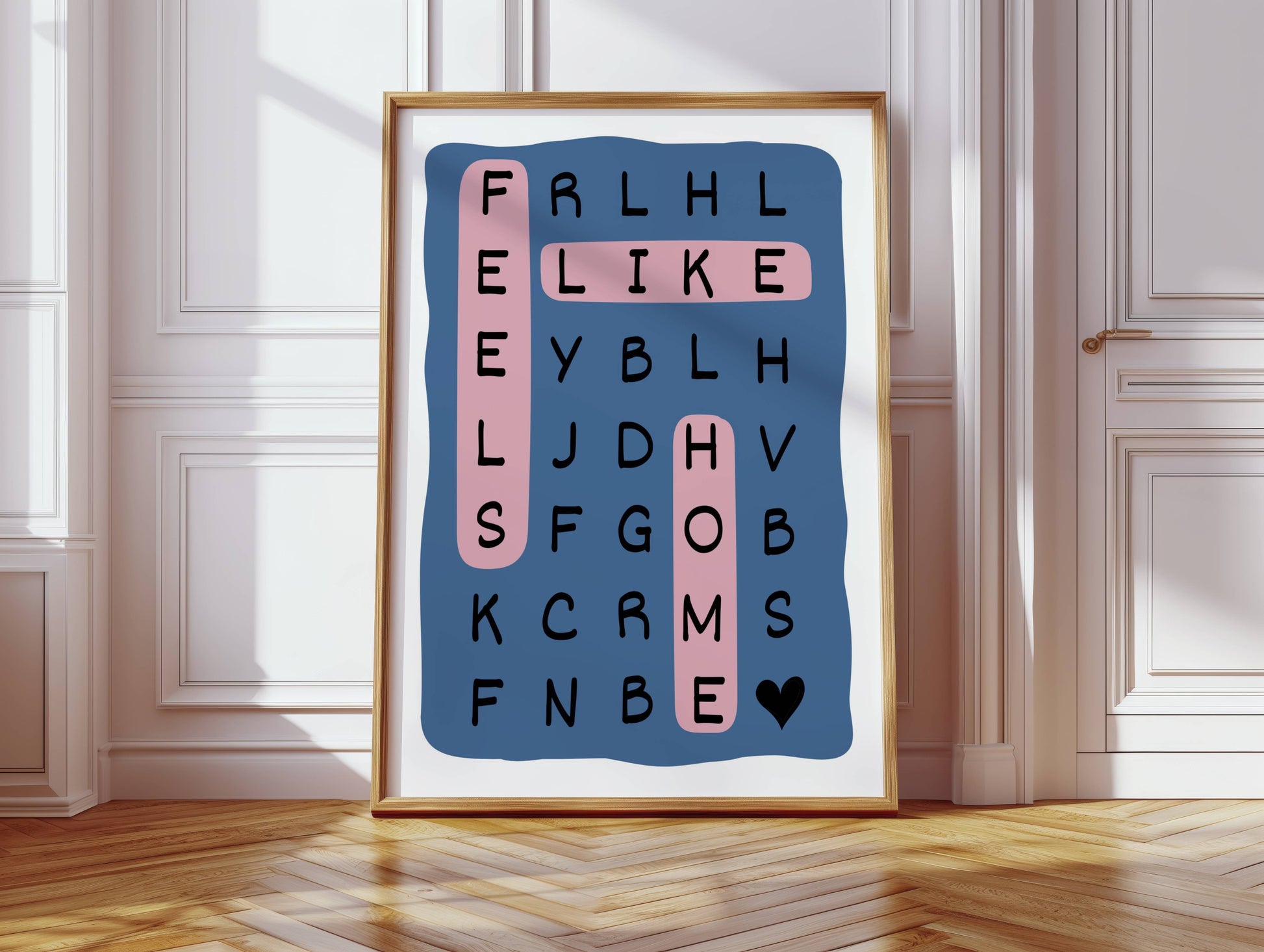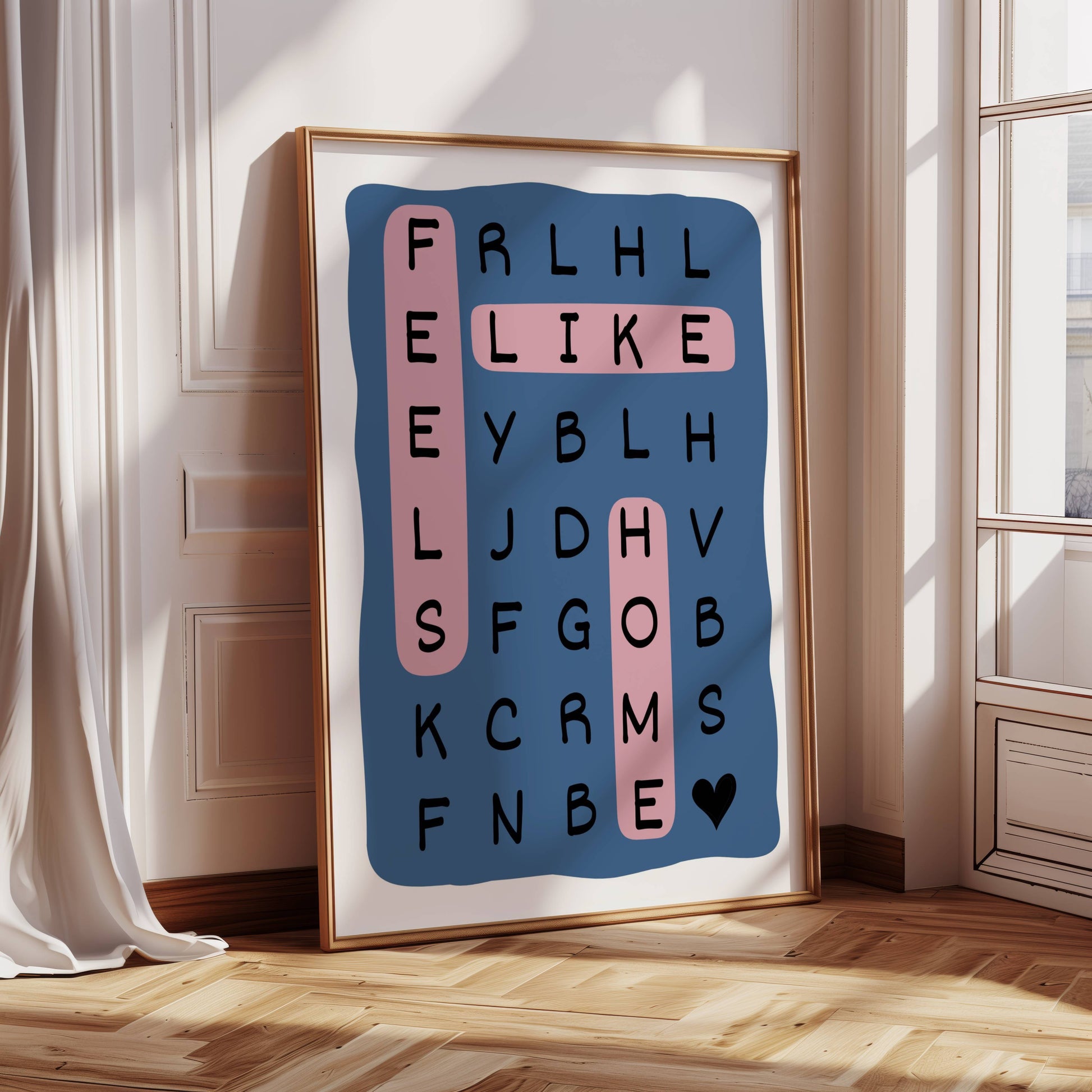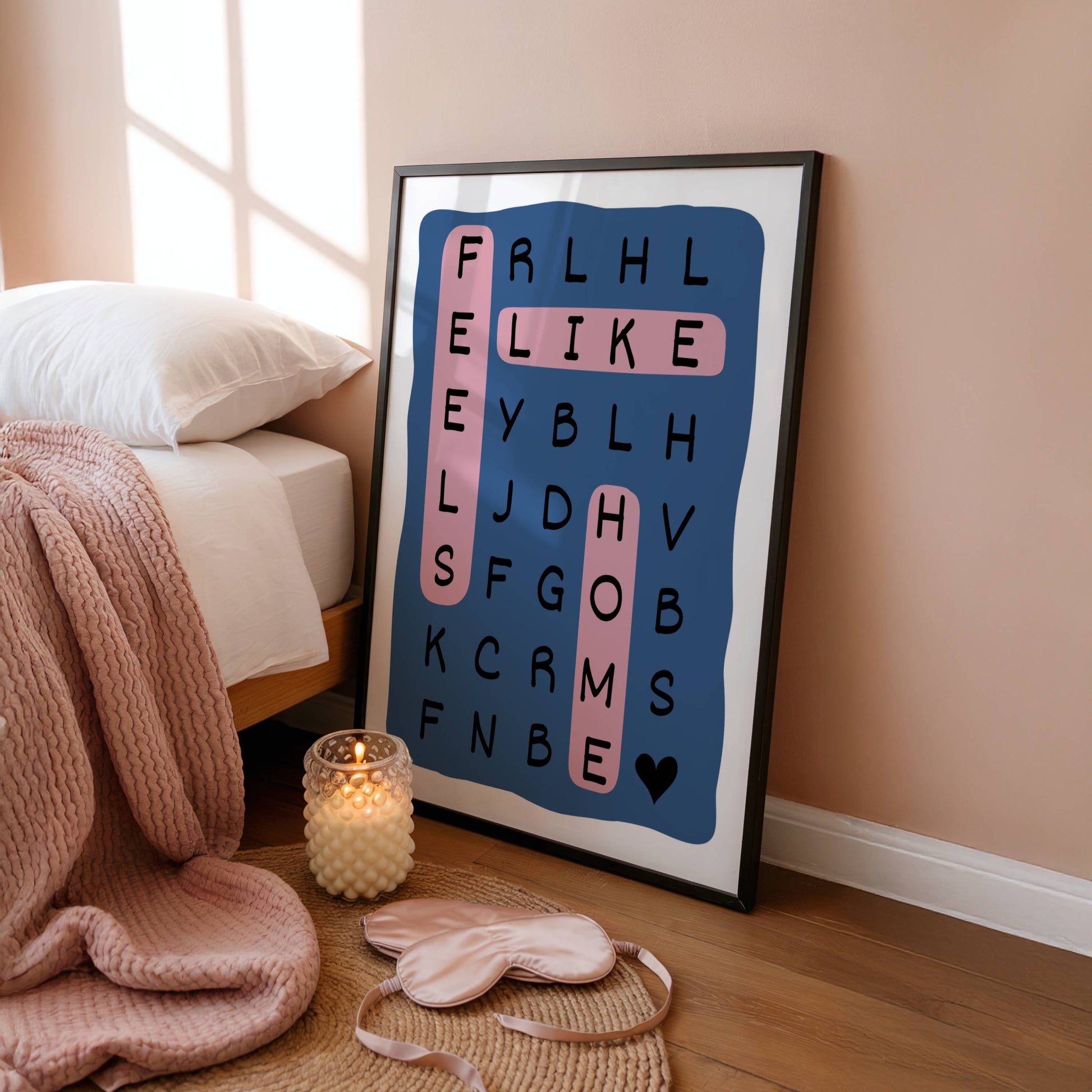Brighten your space with the playful "Feels Like Home" wordsearch wall art, available in cheerful green, blue, or pink. Choose from A5, A4, or A3 sizes to perfectly fit your room’s vibe. This unframed print invites cozy feelings and fun discovery, making any wall feel instantly welcoming.