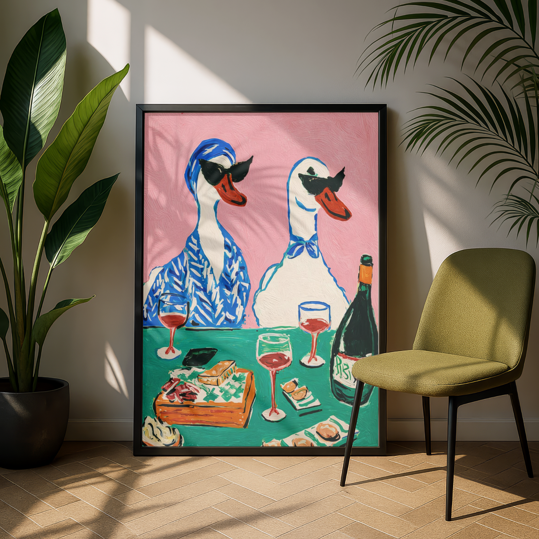 Bring a splash of humour and colour to your kitchen or dining room with this delightful wall art print featuring cheeky ducks enjoying a glass of wine. Perfect for adding personality to your space, this playful design works beautifully as a standalone piece or as part of a gallery wall. Available in three sizes—A5, A4, and A3—you can choose the perfect fit for your room. Unframed and ready to display, it's an affordable way to inject warmth and wit into your home décor. A conversation starter that celebrates the lighter side of life.
