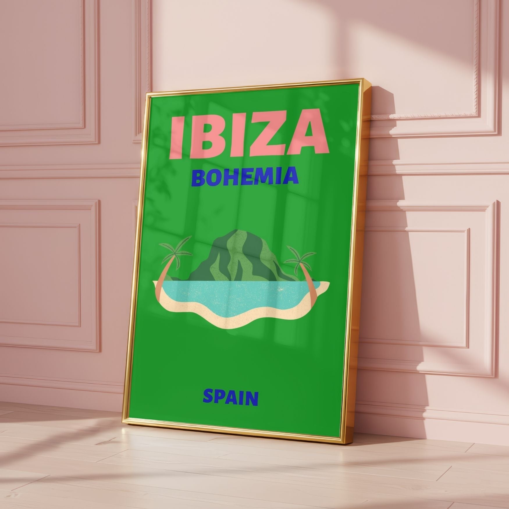 Escape to the Balearic Islands with this stunning Ibiza travel poster. Bursting with colour, it features a vibrant green backdrop, bold coral-pink "IBIZA" lettering, and a stylised island landscape complete with swaying palm trees and turquoise waters. Deep blue accents reading "BOHEMIA" and "SPAIN" add artistic flair, whilst the retro grain texture and mid-century aesthetic bring timeless charm to any space. Perfect for wanderlust seekers and design lovers alike, this eye-catching print captures the carefree spirit of Mediterranean travel. Available unframed in A5, A4, and A3 sizes to suit your décor.