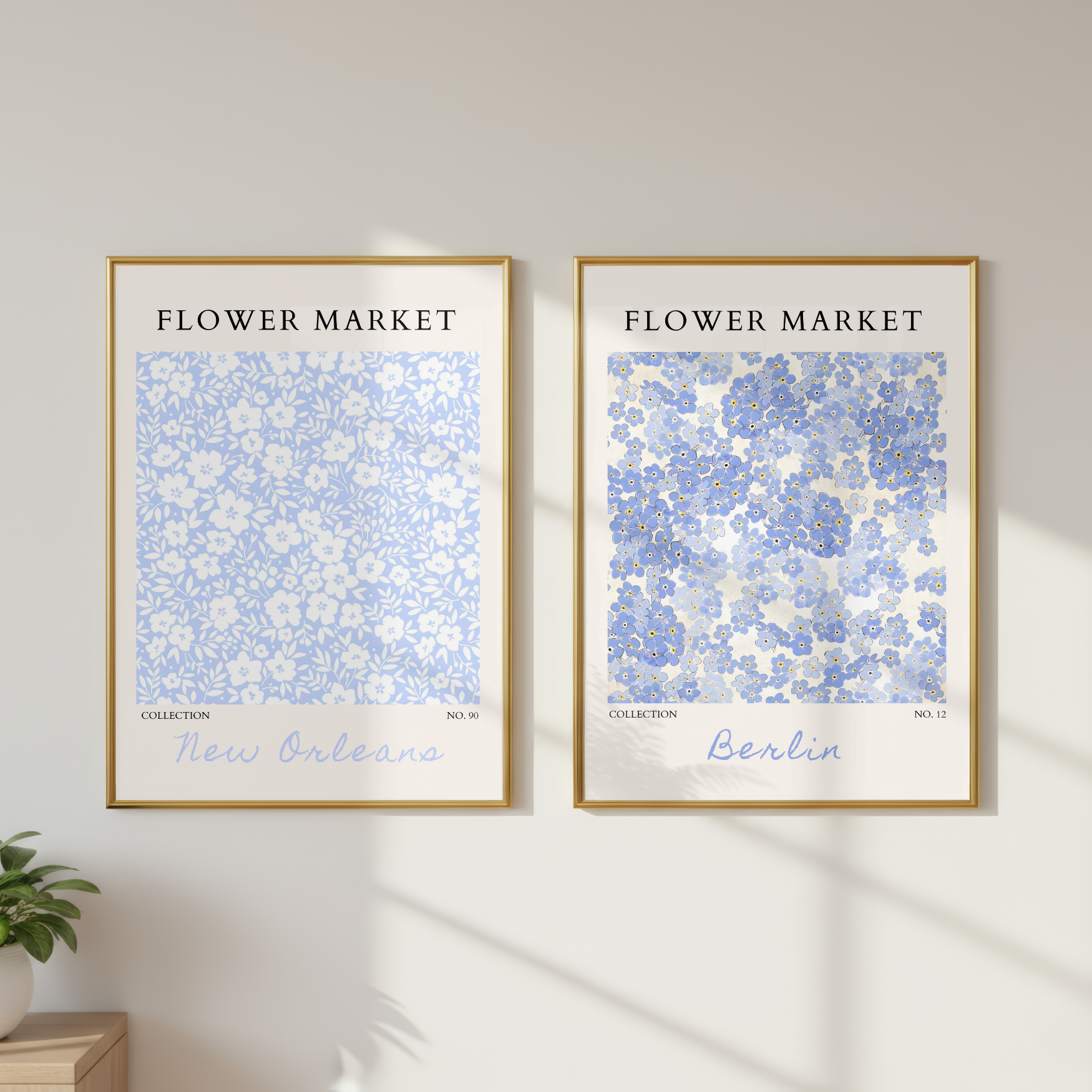 Discover the charm of our Blue Ditsy Bloom Duo—a captivating set pairing Berlin and New Orleans Flower Market prints. Each features delicate, ditsy-style florals rendered in soothing powder blue, creating a harmonious collection that feels both timeless and contemporary. These sister prints share a subtle, elegant aesthetic that effortlessly complements modern minimalist spaces or warm, inviting interiors alike. Available in A5, A4, and A3 sizes, unframed, they're perfect for creating a cohesive gallery wall or displaying individually. Transform your walls with botanical beauty that whispers sophistication.