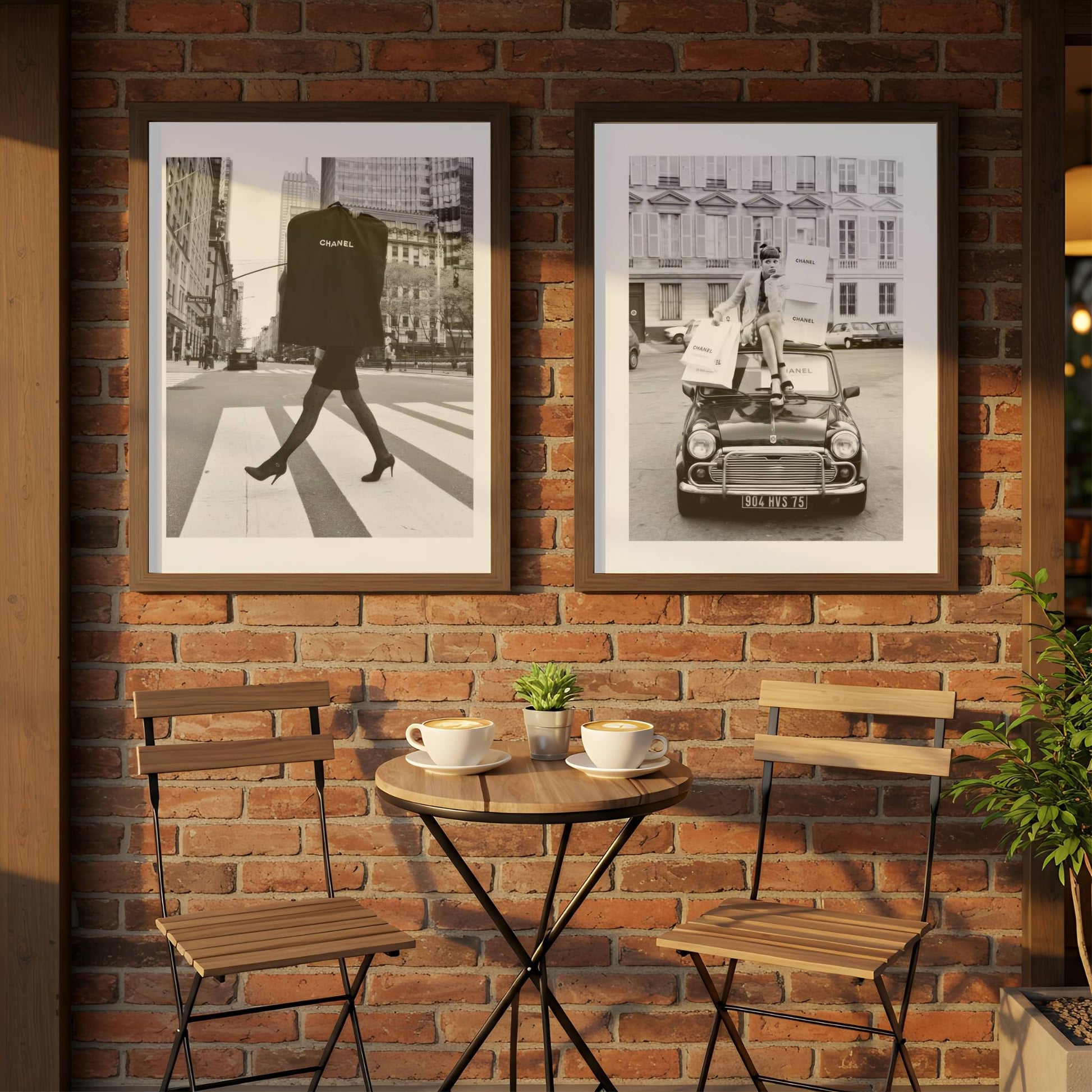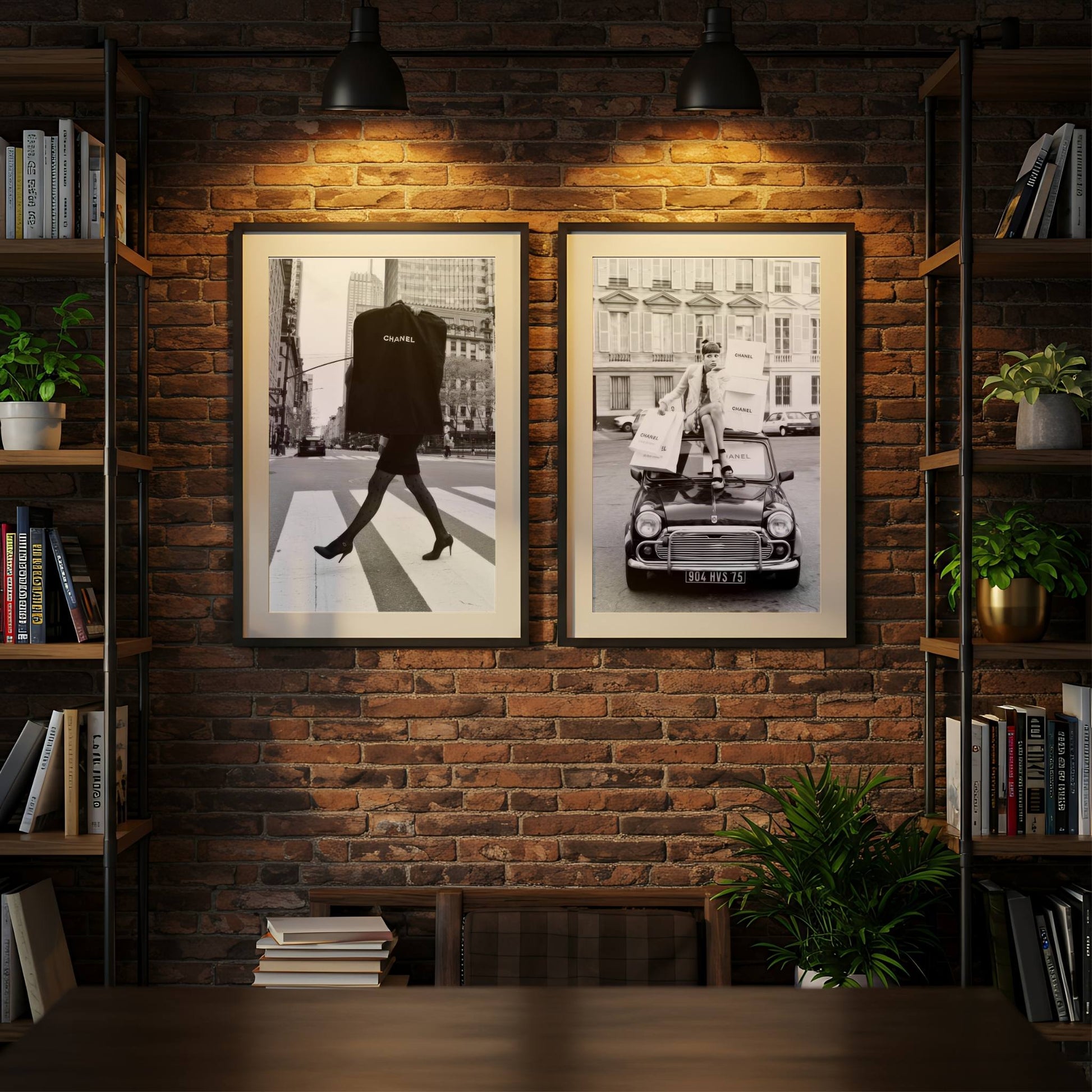 Curate a sophisticated gallery wall with this captivating set of two black and white Chanel fashion prints from the Stockholm collection. One print features an elegant model strolling the sidewalk in timeless style, whilst the second showcases a glamorous figure perched on a luxury car, adorned with iconic Chanel bags. Available unframed in A5, A4, and A3 sizes, these pieces adapt seamlessly to your space and décor preferences. The striking monochromatic aesthetic celebrates the intersection of fashion, luxury, and artistic expression—ideal for those who appreciate haute couture and desire investment-quality wall art that makes a refined statement.