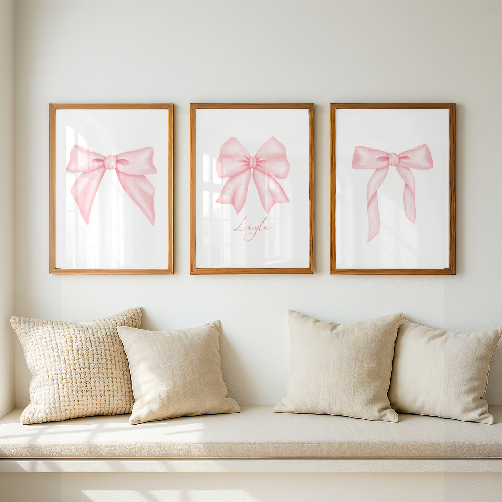 This coordinated trio features three delicate watercolour-style bows in soft blush tones, with the centre print personalised with your chosen name in a graceful script font — making it a truly special and meaningful addition to your child’s space.